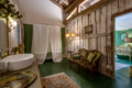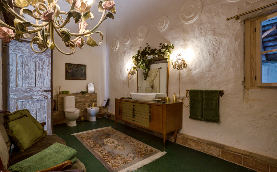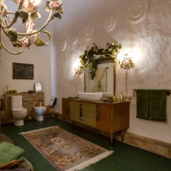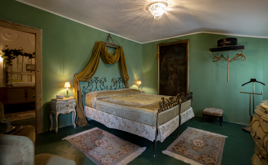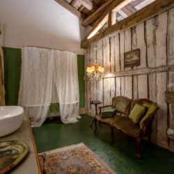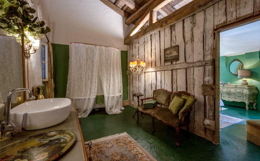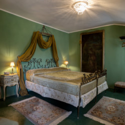 Caratterizzata dal colore verde, questa Suite dispone di letto matrimoniale in ferro battuto con corona a baldacchino e di un salottino da bagno con scenografica vasca retrò e divanetto da lettura. D’epoca anche la parete in legno della stanza da bagno e l’antica travatura del soffitto.