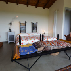 Il letto matrimoniale si affaccia sulla grande vetrata con vista che da direttamente al vigneto Vicario.